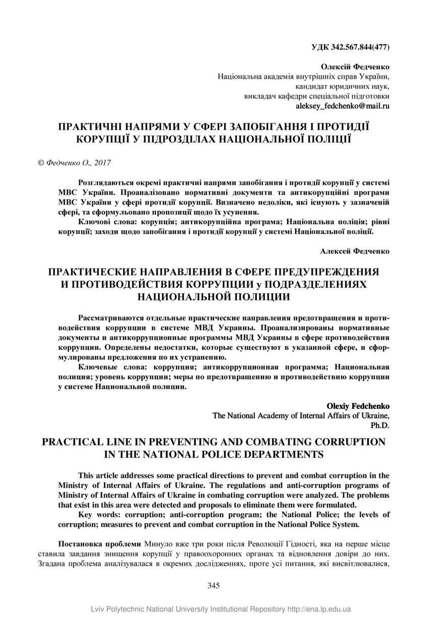 Федченко О. Практичні напрями у сфері запобігання і протидії корупції у підрозділах національної поліції / Олексій Федченко // Вісник Національного університету «Львівська політехніка». Серія: юридичні науки : збірник наукових праць. — Львів : Видавництво Львівської політехніки, 2017. — № 865. — С. 345–349.