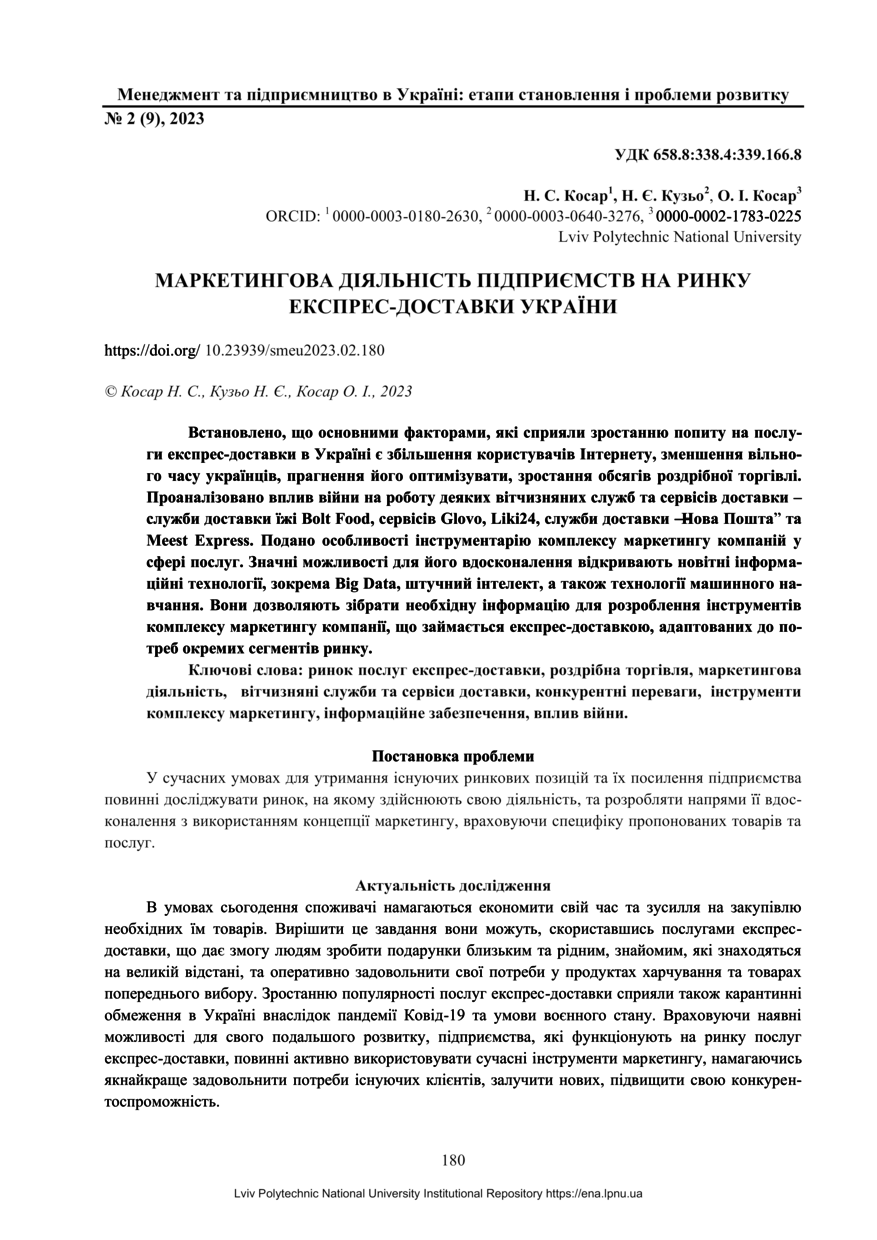 Kosar N. S. Marketing activities of enterprises in the express delivery market of Ukraine / N. S. Kosar, N. Ye. Kuzo, O. I. Kosar // Management and Entrepreneurship in Ukraine: the Stages of Formation and Problems of Development. — Lviv Politechnic Publishing House, 2023. — Vol 5. — No 2. — P. 180–187.
