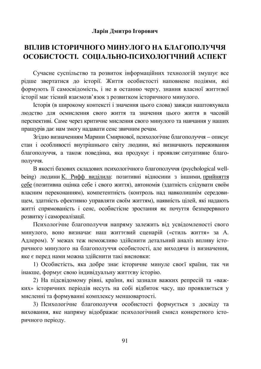Ларін Д. І. Вплив історичного минулого на благополуччя особистості. Соціально-психологічний аспект / Дмитро Ігорович Ларін // Психологія національної безпеки і благополуччя особистості : тези І Міжнародної науково-практичної конференції, 14–15 березня 2019 року, Львів. — Львів : Видавництво Львівської політехніки, 2019. — С. 91–92.