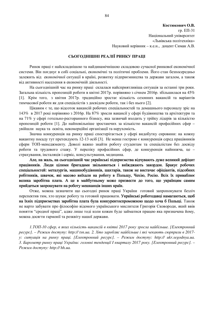 Костюкович О. В. Сьогоднішні реалії ринку праці / О. В. Костюкович, А. В. Симак // Цілі сталого розвитку у вітчизняних реаліях: студентський погляд на проблему : тези доповідей ІІІ Всеукраїнської студентської науково-практичної конференції, 19–20 квітня 2018 року, Львів. — Львів : Видавництво Львівської політехніки, 2018. — С. 84. — (Економіка: ефективність, раціональність, безпечність).