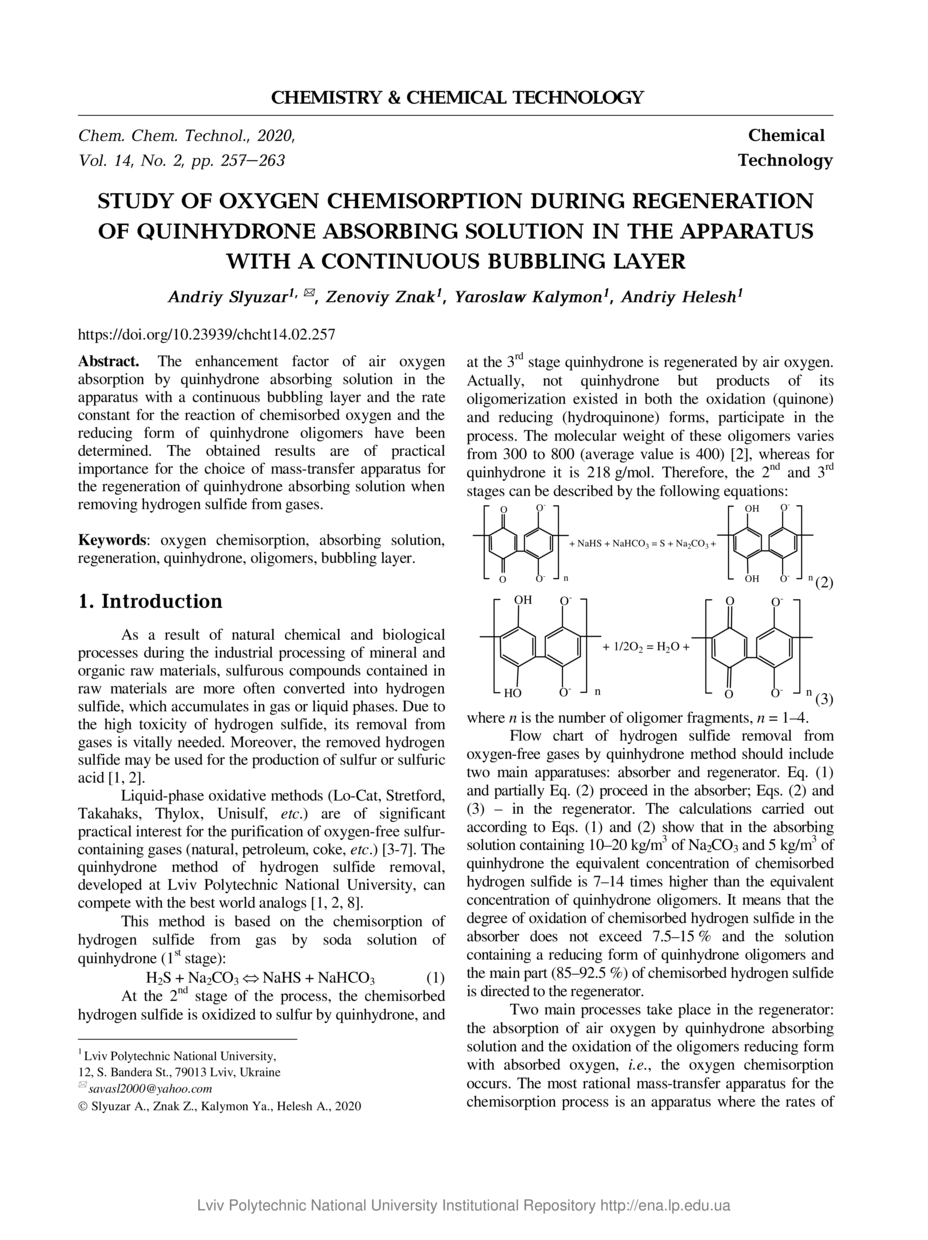 | dc.identifier.citation | Study of Oxygen Chemisorption During Regeneration of Quinhydrone Absorbing Solution in the Apparatus with a Continuous Bubbling Layer / Andriy Slyuzar, Zenoviy Znak, Yaroslaw Kalymon, Andriy Helesh // Chemistry & Chemical Technology. — Lviv : Lviv Politechnic Publishing House, 2020. — Vol 14. — No 2. — P. 257–263. | |