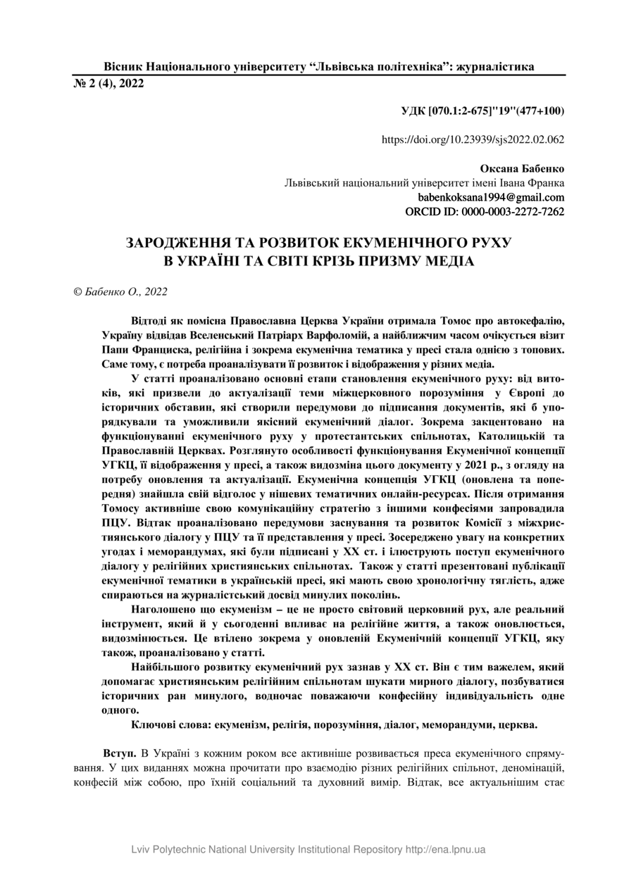 Бабенко О. Зародження та розвиток екуменічного руху в Україні та світі крізь призму медіа / Оксана Бабенко // Вісник Національного університету “Львівська політехніка”. Серія: Журналістика. — Львів : Видавництво Львівської політехніки, 2022. — Том 2 (4). — С. 62–70.