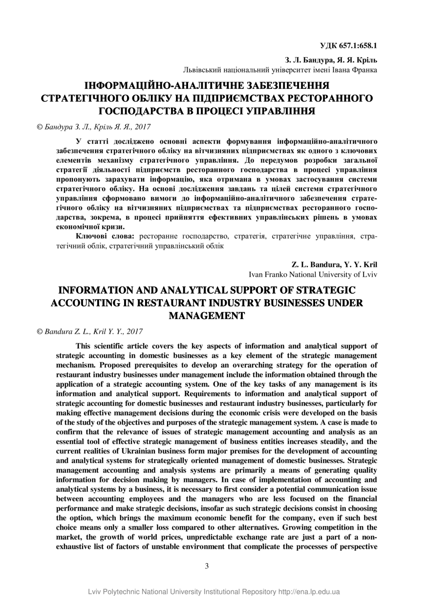 Бандура З. Л. Інформаційно-аналітичне забезпечення стратегічного обліку на підприємствах ресторанного господарства в процесі управління / З. Л. Бандура, Я. Я. Кріль // Вісник Національного університету "Львівська політехніка". Серія : Менеджмент та підприємництво в Україні: етапи становлення і проблеми розвитку : збірник наукових праць. — Львів : Видавництво Львівської політехніки, 2017. — № 862. — С. 3–9.