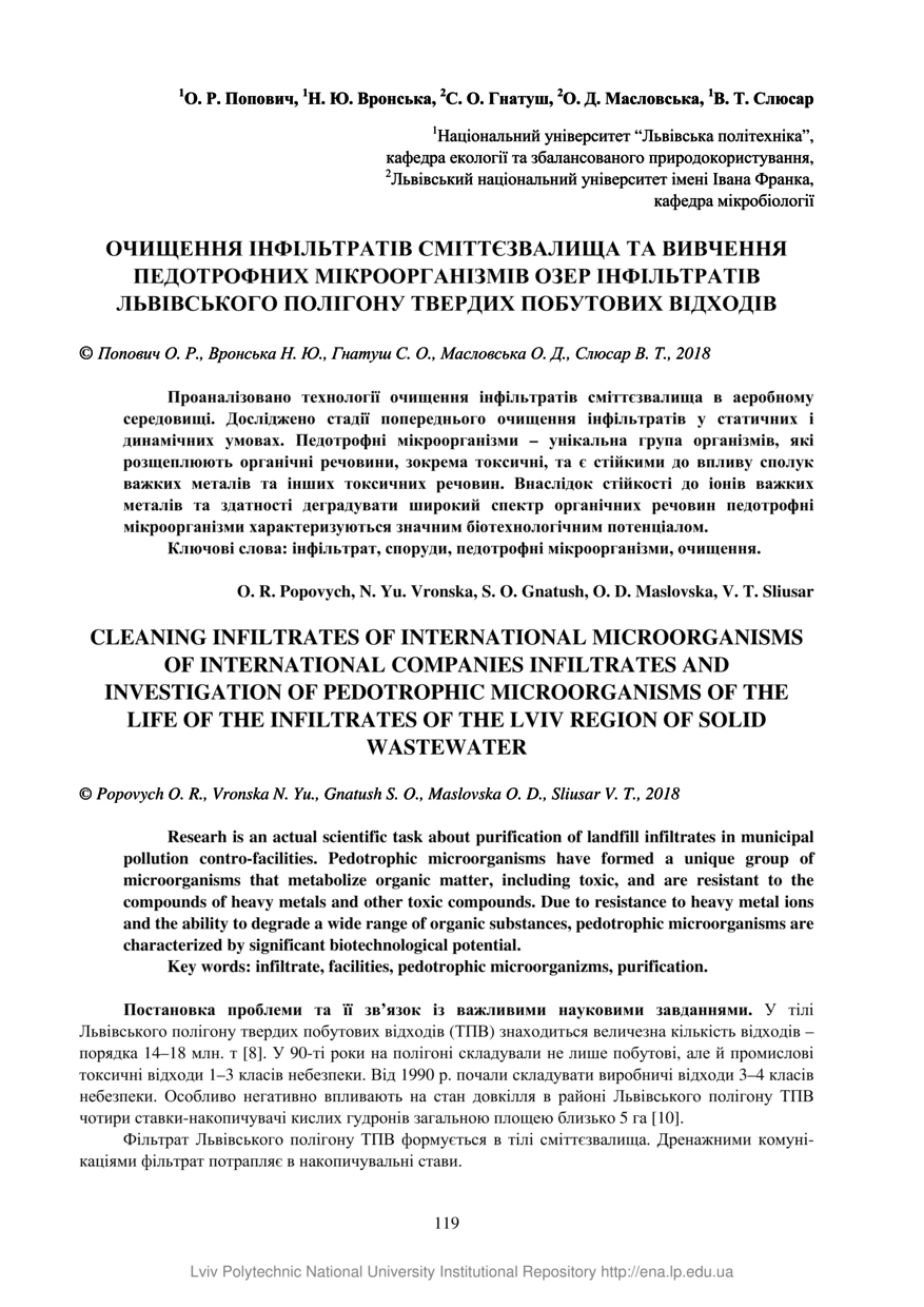Очищення інфільтратів сміттєзвалища та вивчення педотрофних мікроорганізмів озер інфільтратів Львівського полігону твердих побутових відходів / О. Р. Попович, Н. Ю. Вронська, С. О. Гнатуш, О. Д. Масловська, В. Т. Слюсар // Chemistry, Technology and Application of Substances. — Lviv : Lviv Politechnic Publishing House, 2018. — Том 1. — № 2. — С. 119–123.