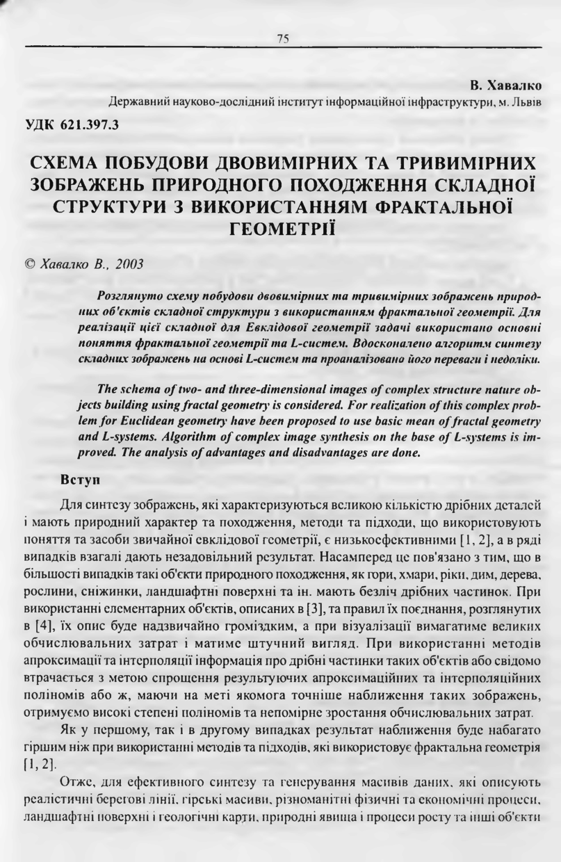 Хавалко В. Схема побудови двовимірних та тривимірних зображень природного походження складної структури з використанням фрактальної геометрії / В. Хавалко // Вісник Національного університету “Львівська політехніка”. — Львів : Видавництво Національного університету “Львівська політехніка”, 2003. — № 496 : Комп'ютерна інженерія та інформаційні технології. — С. 75–79. — (Моделювання процесів і систем).