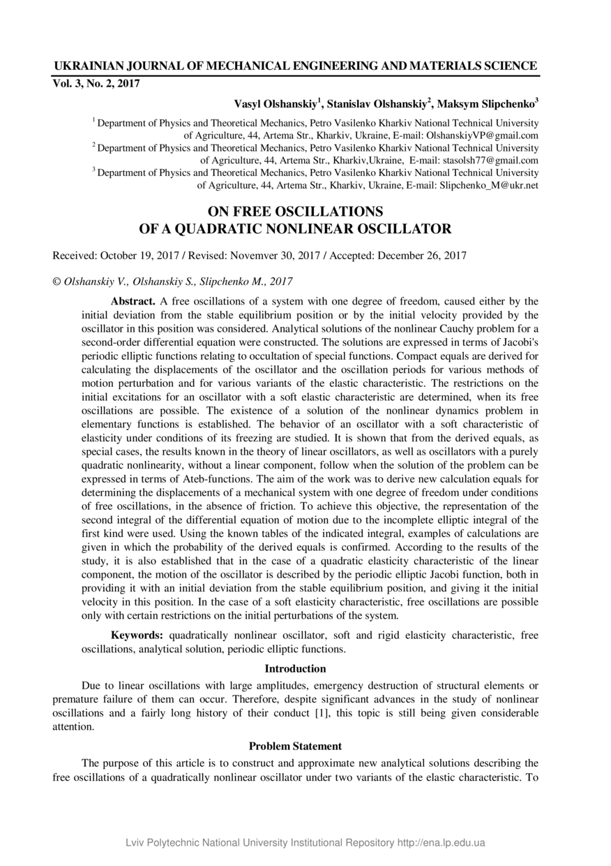 | dc.identifier.citationen | Olshanskiy V. On free oscillations of a quadratic nonlinear oscillator / Vasyl Olshanskiy, Stanislav Olshanskiy, Maksym Slipchenko // Ukrainian Journal of Mechanical Engineering and Materials Science. — Lviv : Lviv Politechnic Publishing House, 2017. — Vol 3. — No 2. — P. 1–10. | |