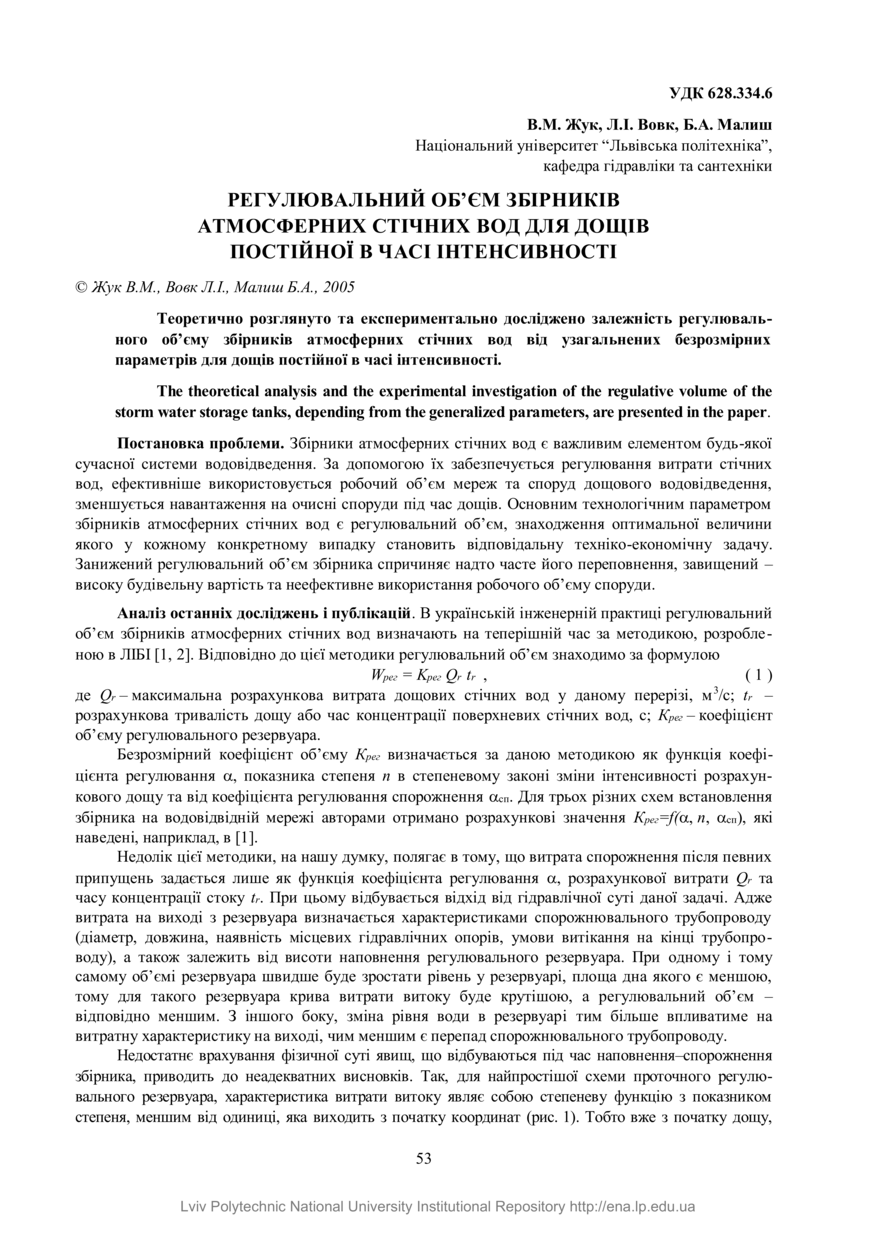 Жук В. М. Регулювальний об’єм збірників атмосферних стічних вод для дощів постійної в часі інтенсивності / В. М. Жук, Л. І. Вовк, Б. А. Малиш // Вісник Національного університету “Львівська політехніка”. — Львів : Видавництво Національного університету “Львівська політехніка”, 2005. — № 545 : Теорія і практика будівництва. — С. 53–60.