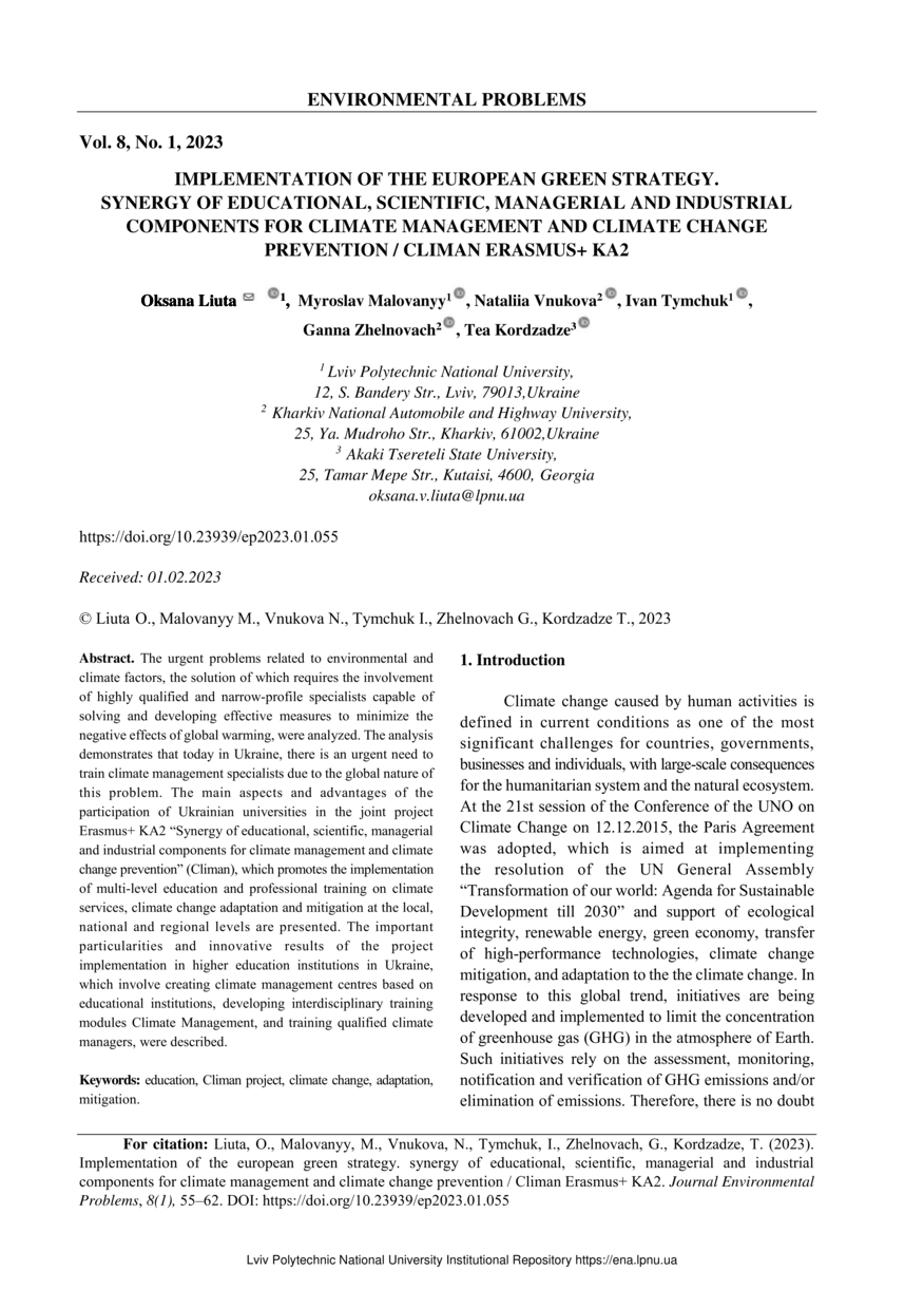 Implementation of the european green strategy. Synergy of educational, scientific, managerial and industrial components for climate management and climate change prevention / Climan Erasmus+ KA2 / Oksana Liuta, Myroslav Malovanyy, Nataliia Vnukova, Ivan Tymchuk, Ganna Zhelnovach, Tea Kordzadze // Environmental Problems. — Lviv : Lviv Politechnic Publishing House, 2023. — Vol 8. — No 1. — P. 55–62.