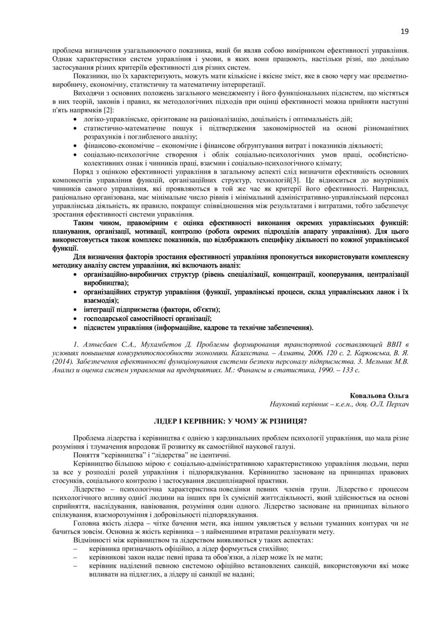 Ковальова О. Лідер і керівник: у чому ж різниця? / Ольга Ковальова, О. Л. Перхач // 77-ма Студентська науково-технічна конференція. Секція "Публічне управління та адміністрування" : збірник тез доповідей, 7 листопада 2019 року, Львів. — Львів : Видавництво Львівської політехніки, 2019. — С. 19–21. — (Адміністративний менеджмент).