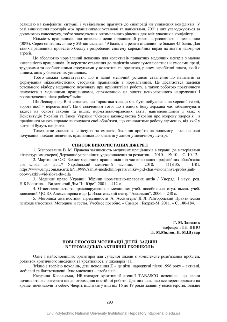 | dc.identifier.citationen | Zakalik H. M. Novi sposoby motyvatsii ditei, zadiiani v "Hromadsko-aktyvnii ekoshkoli" / H. M. Zakalik, L. M. Milian, N. M. Shuvar // Zakhyst prav i svobod liudyny ta hromadianyna v umovakh formuvannia pravovoi derzhavy : zbirnyk tez IKh Vseukrainskoi naukovo-praktychnoi konferentsii, 30 travnia 2020 roku, Lviv. — Lviv : Lviv Politechnic Publishing House, 2020. — P. 293–296. — (Svoboda ZMI i svoboda slova ta psykholohichni aspekty v konteksti zakhystu prav i svobod liudyny ta hromadianyna v umovakh formuvannia pravovoi derzhavy). | |