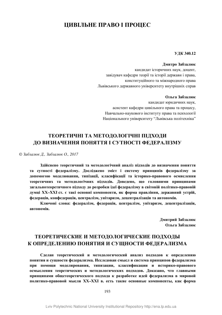 Забзалюк Д. Теоретичні та методологічні підходи до визначення поняття і сутності федералізму / Дмитро Забзалюк, Ольга Забзалюк // Вісник Національного університету "Львівська політехніка". Серія: Юридичні науки. — Львів : Видавництво Львівської політехніки, 2017. — № 884. — С. 193–204.