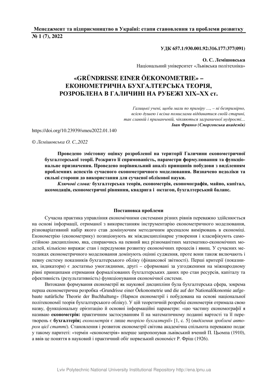 Лемішовська О. С. «Gründrisse einer öekonometrie» – економетрична бухгалтерська теорія, розроблена в Галичині на рубежі ХІХ–ХХ ст. / О. С. Лемішовська // Менеджмент та підприємництво в Україні: етапи становлення і проблеми розвитку. — Львів : Видавництво Львівської політехніки, 2022. — Том 4. — № 1. — С. 140–158.