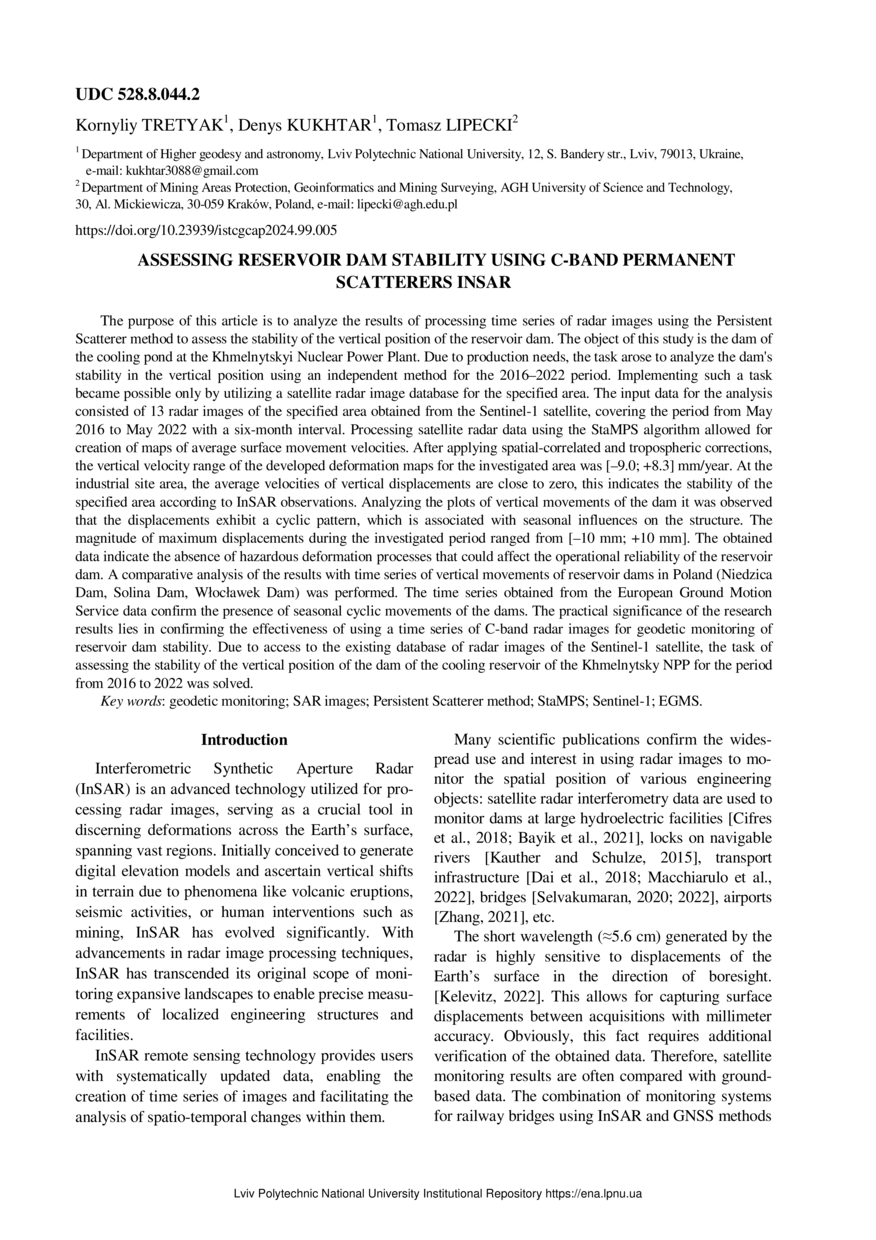 Tretyak K. Assessing reservoir dam stability using C-band permanent scatterers INSAR / Kornyliy Tretyak, Denys Kukhtar, Tomasz Lipecki // Geodesy, Cartography and Aerial Photography. — Lviv : Lviv Politechnic Publishing House, 2024. — No 99. — P. 5–14.