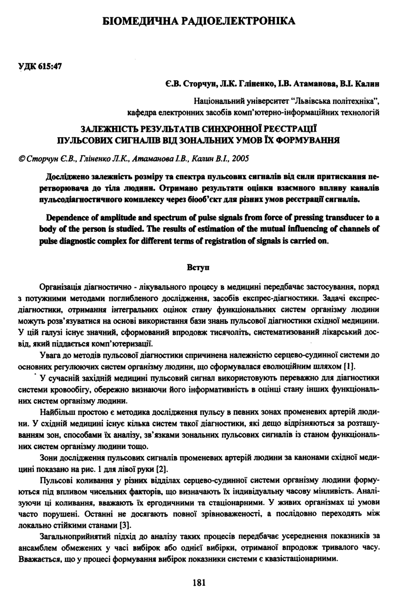 Залежність результатів синхронної реєстрації пульсових сигналів від зональних умов їх формування / Є. В. Сторчун, Л. К. Гліненко, І. В. Атаманова, В. І. Калин // Вісник Національного університету “Львівська політехніка”. — Львів : Видавництво Національного університету “Львівська політехніка”, 2005. — № 534 : Радіоелектроніка та телекомунікації. — С. 181–185. — (Біомедична радіоелектроніка).