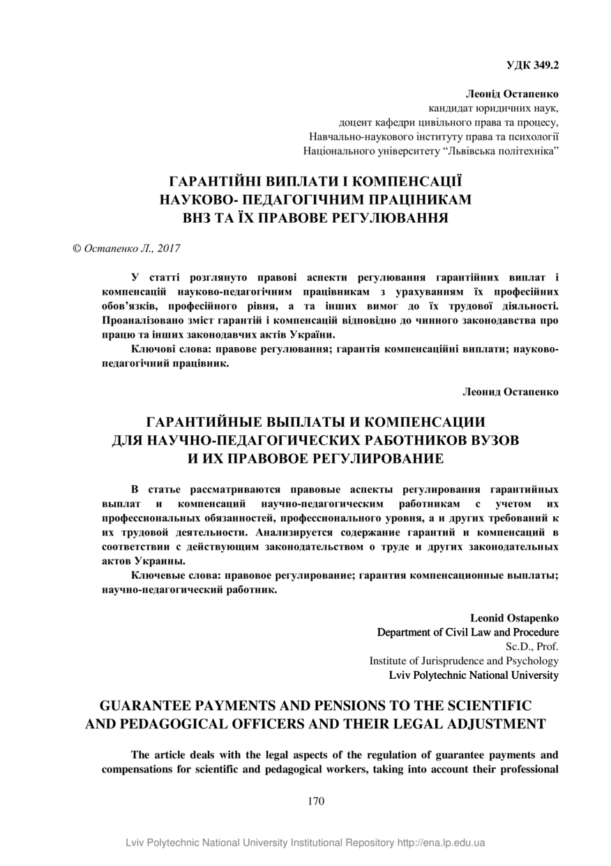 Остапенко Л. Гарантійні виплати і компенсації науково-педагогічним працівникам ВНЗ та їх правове регулювання / Леонід Остапенко // Вісник Національного університету "Львівська політехніка". Серія: Юридичні науки. — Львів : Видавництво Львівської політехніки, 2017. — № 884. — С. 170–175.
