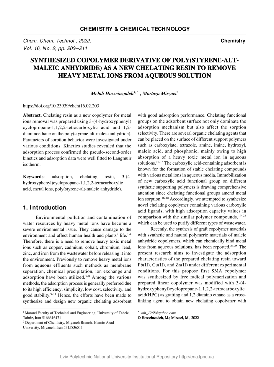 | dc.identifier.citation | Hosseinzadeh M. Synthesized Copolymer Derivative of Poly(Styrene-alt-Maleic Anhydride) as a New Chelating Resin to Remove Heavy Metal Ions from Aqueous Solution / Mehdi Hosseinzadeh, Mortaza Mirzaei // Chemistry & Chemical Technology. — Lviv : Lviv Politechnic Publishing House, 2022. — Vol 16. — No 2. — P. 203–211. | |