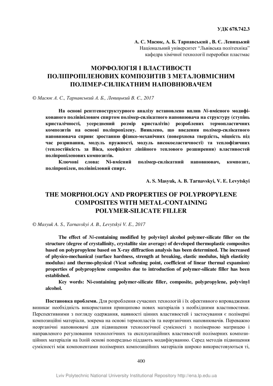 Масюк А. С. Морфологія і властивості поліпропіленових композитів з металовмісним полімер-силікатним наповнювачем / А. С. Масюк, А. Б. Тарнавський, В. Є. Левицький // Вісник Національного університету «Львівська політехніка». Серія: Хімія, технологія речовин та їх застосування. — Львів : Видавництво Львівської політехніки, 2017. — № 868. — С. 400–405.