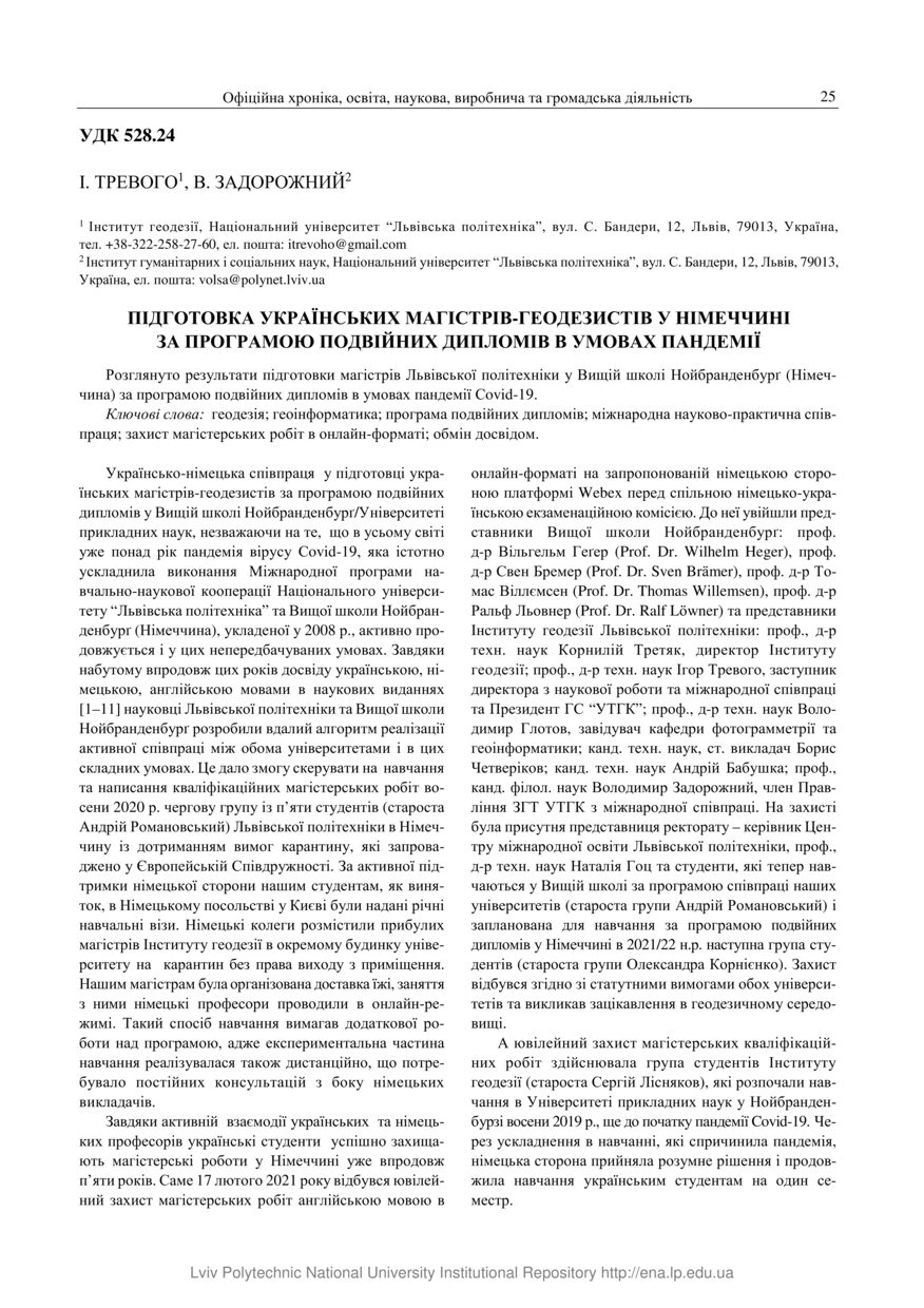 Тревого І. Підготовка українських магістрів-геодезистів в Німеччині за програмою подвійних дипломів в умовах пандемії / І. Тревого, В. Задорожний // Сучасні досягнення геодезичної науки та виробництва. — Львів : Видавництво Львівської політехніки, 2021. — Том 1(41). — С. 25–28.