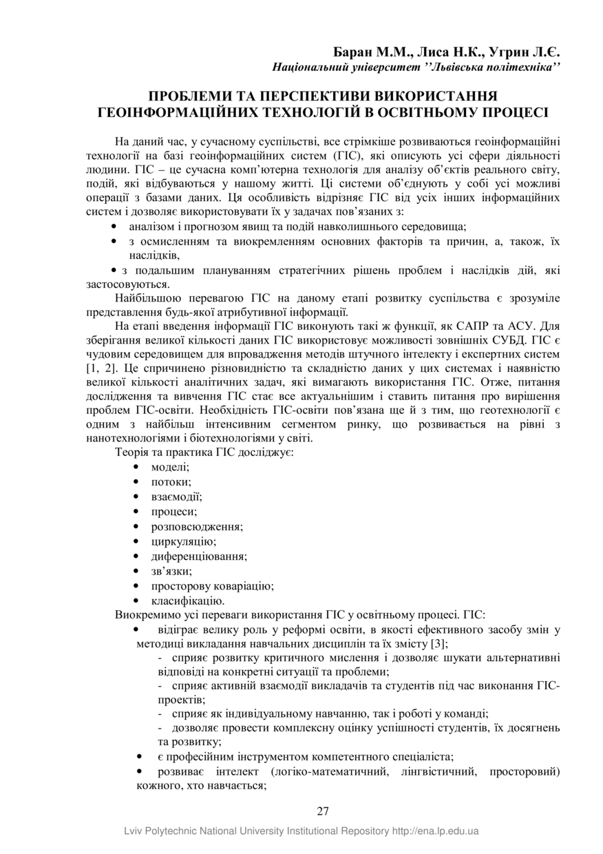Баран М. М. Проблеми та перспективи використання геоінформаційних технологій в освітньому процесі / М. М. Баран, Н. К. Лиса, Л. Є. Угрин // Проблеми та перспективи розвитку економіки і підприємництва та комп’ютерних технологій в Україні : збірник тез доповідей ХIV Науково-практичної конференції, 17-20 квітня 2018 року. — Львів : Видавництво Львівської політехніки, 2018. — С. 27–28. — (IT: технології, розробки, тренди).