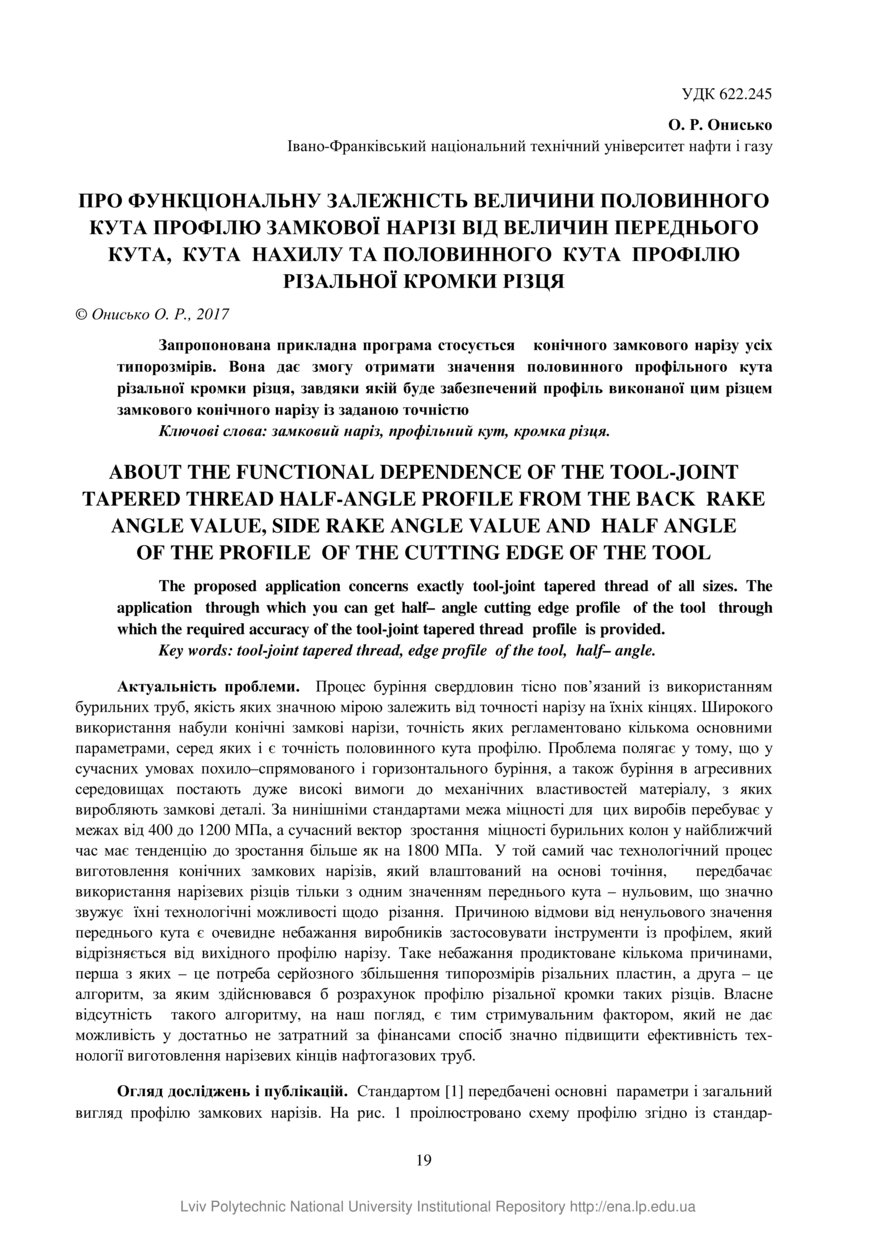 Онисько О. Р. Про функціональну залежність величини половинного кута профілю замкової нарізі від величин переднього кута, кута нахилу та половинного кута профілю різальної кромки різця / О. Р. Онисько // Вісник Національного університету «Львівська політехніка». Серія: Оптимізація виробничих процесів і технічний контроль у машинобудуванні та приладобудуванні. — Львів : Видавництво Львівської політехніки, 2017. — Том 867. — С. 19–28.