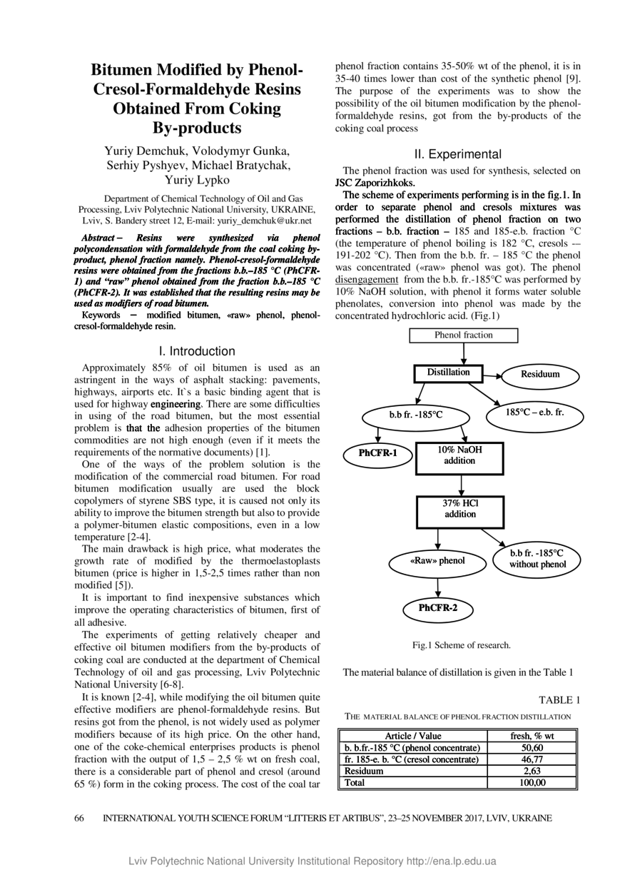 Bitumen modified by phenol-cresol-formaldehyde resins obtained from coking by-products / Yuriy Demchuk, Volodymyr Gunka, Serhiy Pyshyev, Michael Bratychak, Yuriy Lypko // Litteris et Artibus : proceedings, 23–25 November, 2017. — Lviv : Lviv Polytechnic Publishing House, 2017. — P. 66–67. — (6th International academic conference «Chemistry & chemical technology 2017» (CCT-2017)).