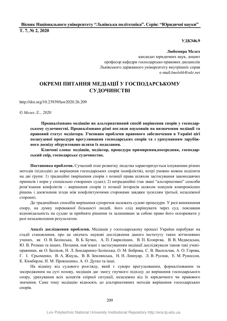Мелех Л. Окремі питання медіації у господарському судочинстві / Любомира Мелех // Вісник Національного університету “Львівська політехніка”. Серія: Юридичні науки. — Львів : Видавництво Львівської політехніки, 2020. — Том 7. — № 2. — С. 209–215.