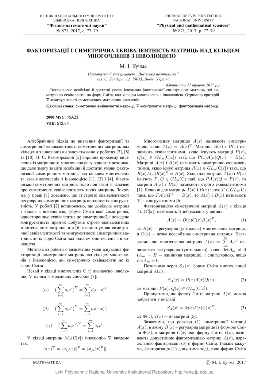 | dc.relation.referencesen | [4] Zelisko V. R., Kuchma M. I. Faktoryzatsiia symetrychnykh matryts nad kiltsiamy mnohochleniv z involiutsiieiu, Mat. metody i fiz.-mekh. polia, 1997, 40, No 4 – P. 91–95. | |