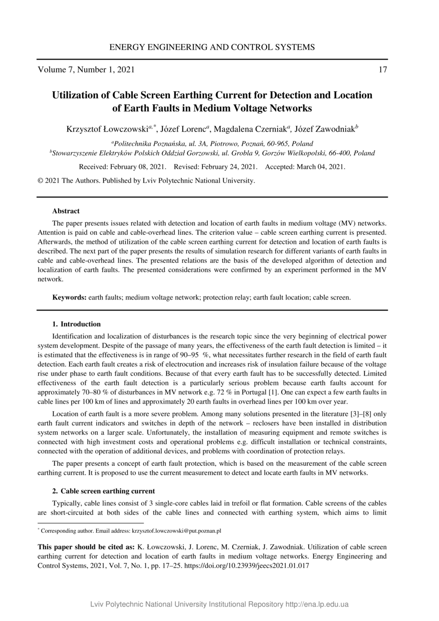 Utilization of cable screen earthing current for detection and location of earth faults in medium voltage networks / Krzysztof Łowczowski, Józef Lorenc, Magdalena Czerniak, Józef Zawodniak // Energy Engineering and Control Systems. — Lviv : Lviv Politechnic Publishing House, 2021. — Vol 7. — No 1. — P. 17–25.
