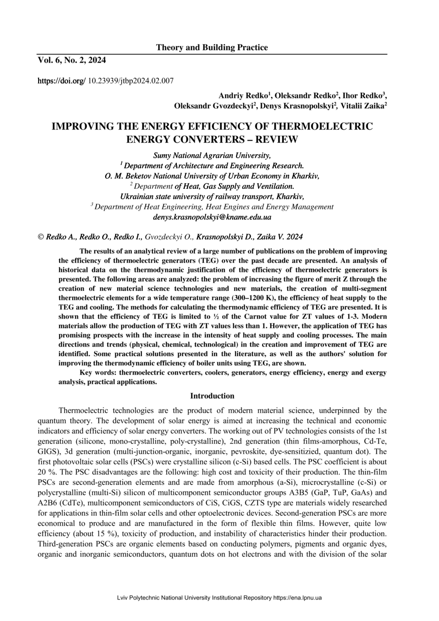Improving the energy efficiency of thermoelectric energy converters – review / Andriy Redko, Oleksandr Redko, Ihor Redko, Oleksandr Gvozdeckyi, Denys Krasnopolskyi, Vitalii Zaika // Theory and Building Practice. — Lviv : Lviv Politechnic Publishing House, 2024. — Vol 6. — No 2. — P. 7–18.