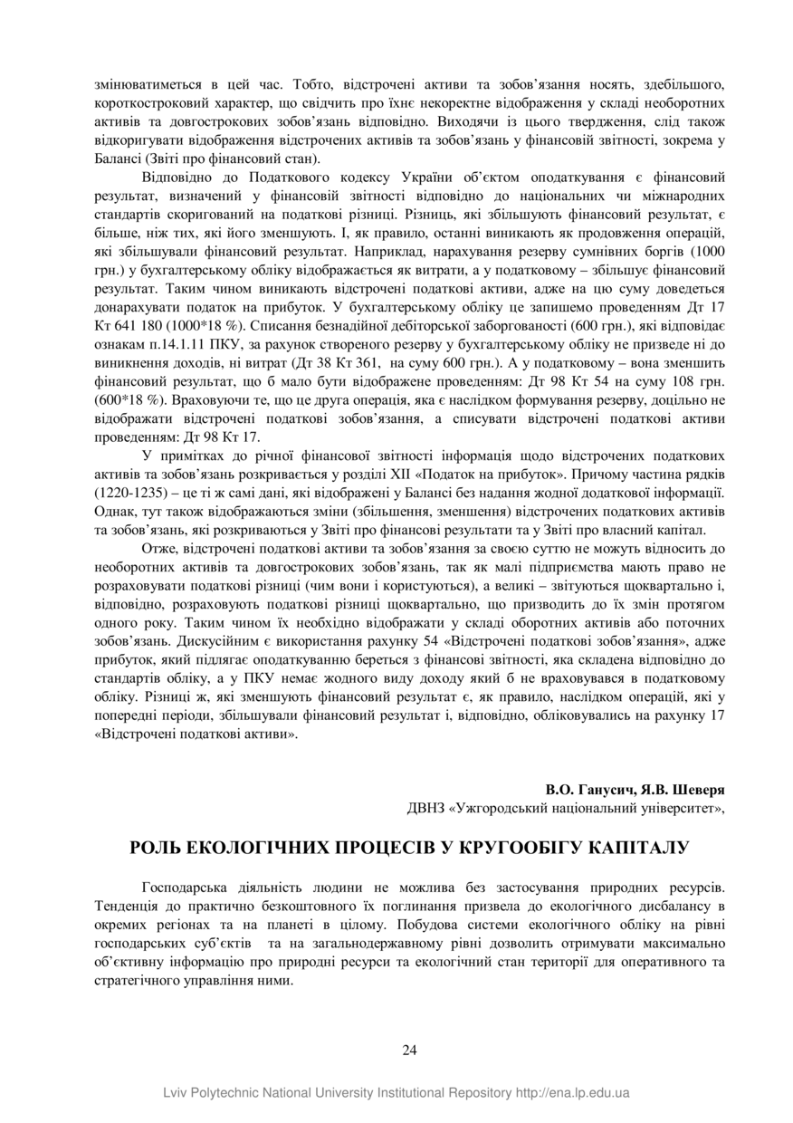 Ганусич В. О. Роль екологічних процесів у кругообігу капіталу / В. О. Ганусич, Я. В. Шеверя // Фінансовий ринок: інституції та інструменти, 3–6 червня 2018 року, Львів. — Львів : Видавництво Львівської політехніки, 2018. — С. 24–26.