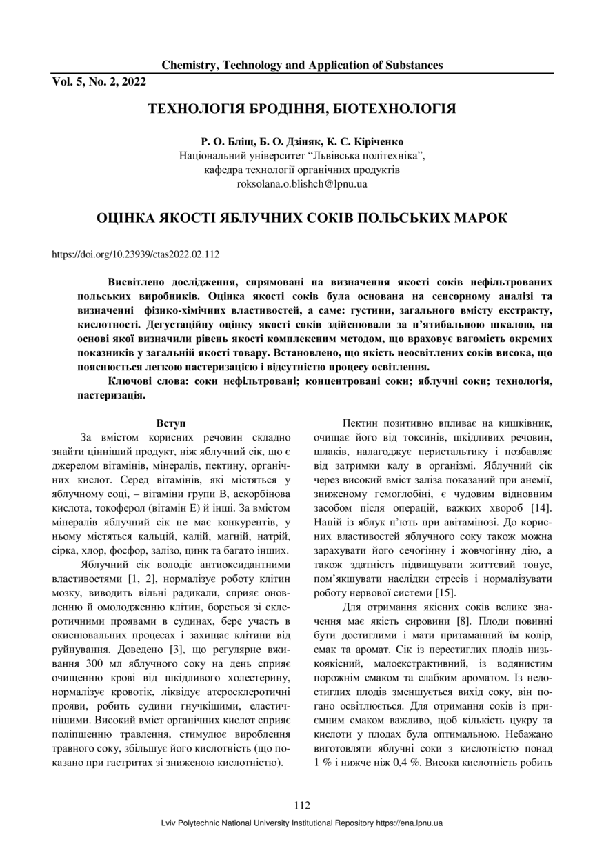 Бліщ Р. О. Оцінка якості яблучних соків польських марок / Р. О. Бліщ, Б. О. Дзіняк, К. С. Кіріченко // Chemistry, Technology and Application of Substances. — Lviv : Lviv Politechnic Publishing House, 2022. — Том 5. — № 2. — С. 112–117.
