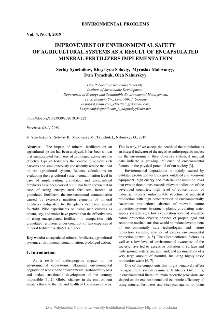 Improvement of environmental safety of agricultural systems as a result of encapsulated mineral fertilizers implementation / Serhiy Synelnikov, Khrystyna Soloviy, Ivan Tymchuk, Myroslav Malovanyy, Oleh Nahurskyy // Environmental Problems. — Lviv : Lviv Politechnic Publishing House, 2019. — Vol 4. — No 4. — P. 222–228.