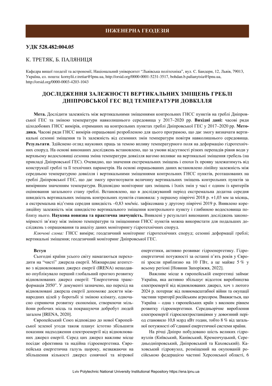Третяк К. Дослідження залежності вертикальних зміщень греблі Дніпровської ГЕС від температури довкілля / К. Третяк, Б. Паляниця // Сучасні досягнення геодезичної науки та виробництва. — Львів : Видавництво Львівської політехніки, 2024. — Том 1. — № 47. — С. 76–88.