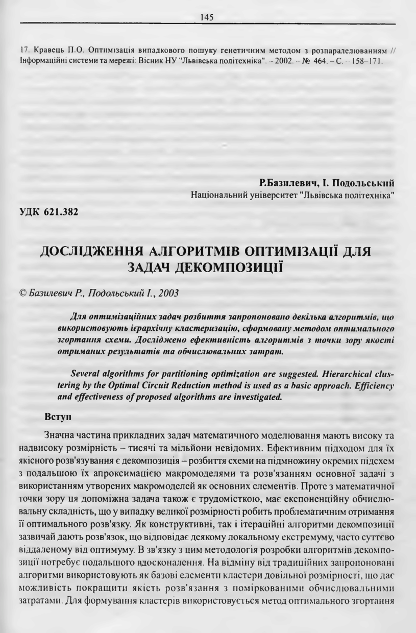 Базилевич Р. Дослідження алгоритмів оптимізації для задач декомпозиції / Р. Базилевич, І. Подольський // Вісник Національного університету “Львівська політехніка”. — Львів : Видавництво Національного університету “Львівська політехніка”, 2003. — № 496 : Комп'ютерна інженерія та інформаційні технології. — С. 145–152. — (Методи й алгоритми сучасних інформаційних технологій).