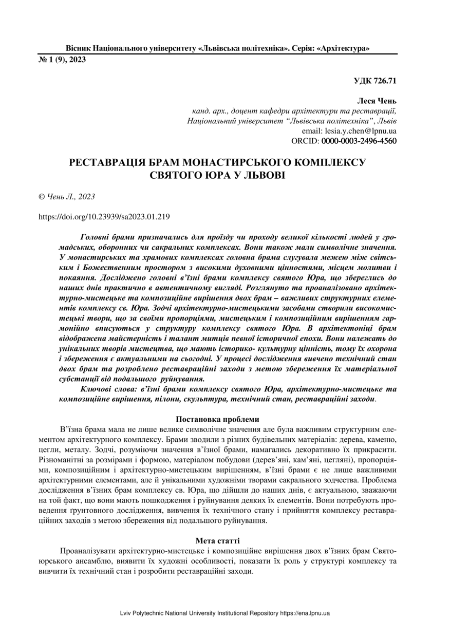 | dc.identifier.citationen | Chen L. Restoration of the gates of the monastery complex of saint George in Lviv / Chen Lesya // Visnyk Natsionalnoho universytetu "Lvivska politekhnika". Serie: Arkhitektura. — Lviv : Lviv Politechnic Publishing House, 2023. — Vol 5. — No 1. — P. 219–226. | |