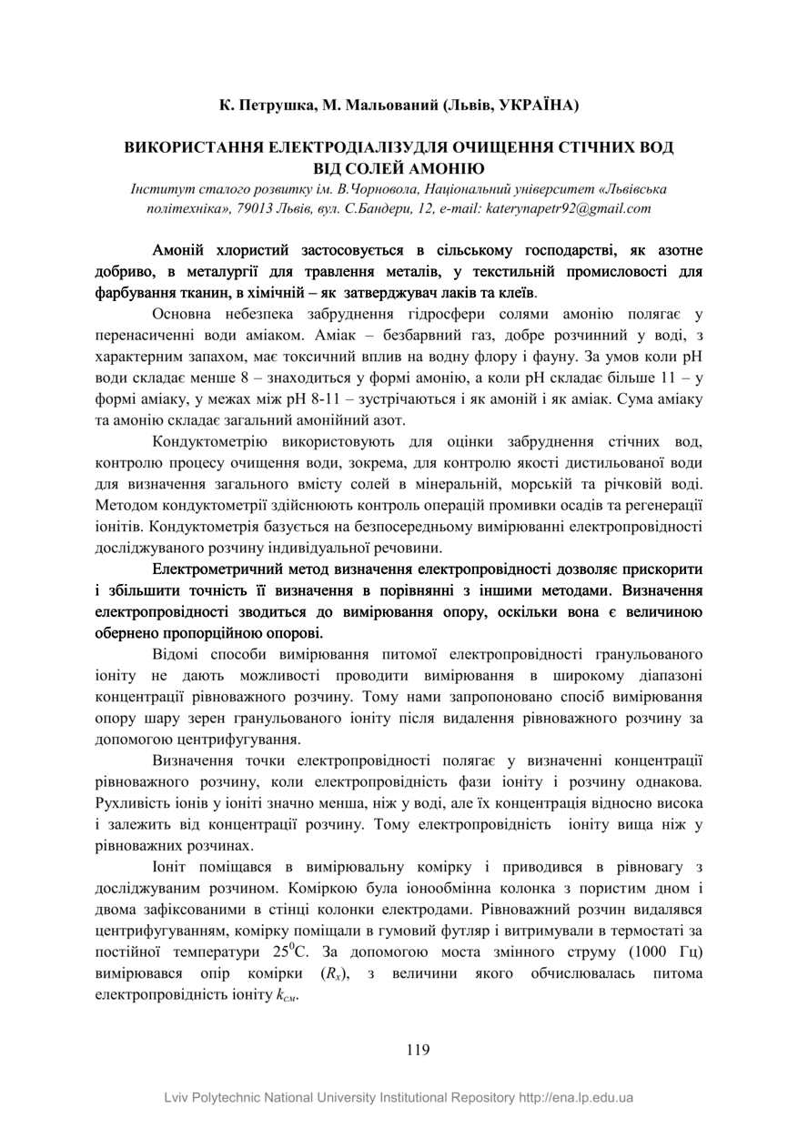Петрушка К. Використання електродіалізудля очищення стічних вод від солей амонію / К. Петрушка, М. Мальований // Сталий розвиток – стан та перспективи : матеріали міжнародного наукового симпозіуму SDEV‘2018, Львів-Славське, Україна, 28 лютого–3 березня 2018 року. — Львів : Панорама, 2018. — С. 119–120. — (Технології захисту довкілля для сталого розвитку).