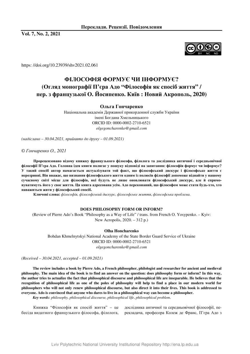 Honcharenko O. Does Philosophy Form or Inform? (Review of the Monograph Pierre Ado “Philosophy as a Way of Life”. Transl. by O. Yosypenko. Kyiv: New Acropolis, 2020) / Olha Honcharenko // Humanitarian Vision. — Lviv : Lviv Politechnic Publishing House, 2021. — Vol 7. — No 2. — P. 61–64.