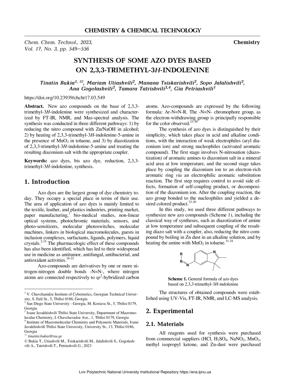 Synthesis of Some Azo Dyes Based on 2,3,3-Trimethyl-3H-indolenine / Tinatin Bukia, Mariam Utiashvili, Manana Tsiskarishvili, Sopo Jalalishvili, Ana Gogolashvili, Tamara Tatrishvili, Gia Petriashvili // Chemistry & Chemical Technology. — Lviv : Lviv Politechnic Publishing House, 2023. — Vol 17. — No 3. — P. 549–556.