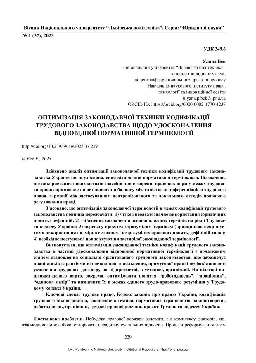 | dc.identifier.citation | Бек У. Оптимізація законодавчої техніки кодифікації трудового законодавства щодо удосконалення відповідної нормативної термінології / Уляна Бек // Вісник Національного університету “Львівська політехніка”. Серія: Юридичні науки. — Львів : Видавництво Львівської політехніки, 2023. — № 1(37). — С. 229–235. | |
