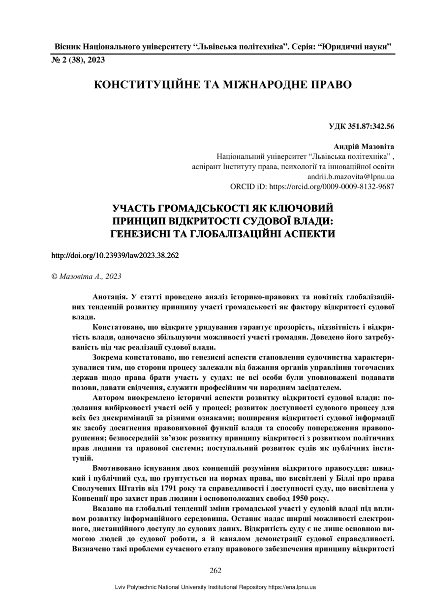 Мазовіта А. Участь громадськості як ключовий принцип відкритості судової влади: генезисні та глобалізаційні аспекти / Андрій Мазовіта // Вісник Національного університету “Львівська політехніка”. Серія: “Юридичні науки”. — Львів : Видавництво Львівської політехніки, 2023. — № 2 (38). — С. 262–267.