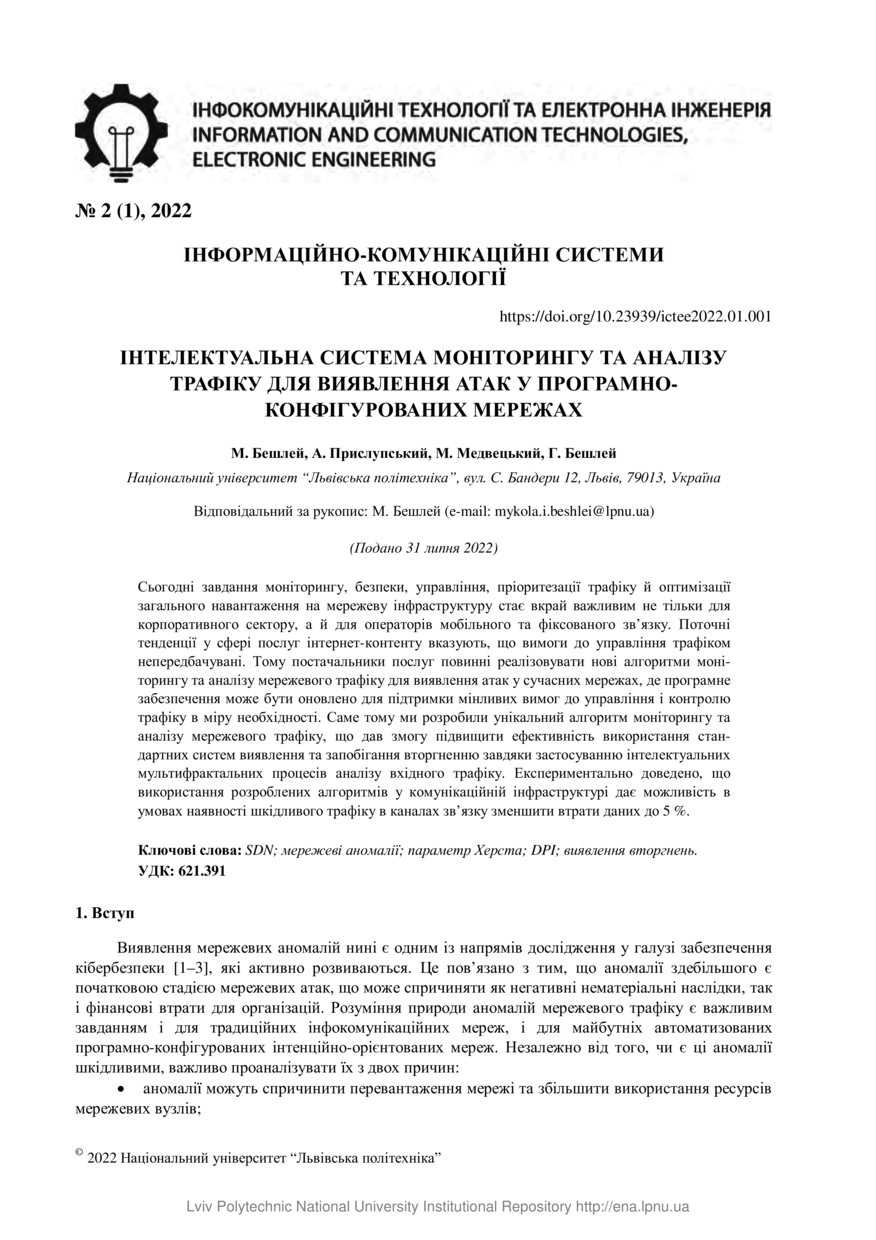 Інтелектуальна система моніторингу та аналізу трафіку для виявлення атак у програмно-конфігурованих мережах / М. Бешлей, А. Прислупський, М. Медвецький, Г. Бешлей // Інфокомунікаційні технології та електронна інженерія. — Львів : Видавництво Львівської політехніки, 2022. — Том 2. — № 1. — С. 1–11.