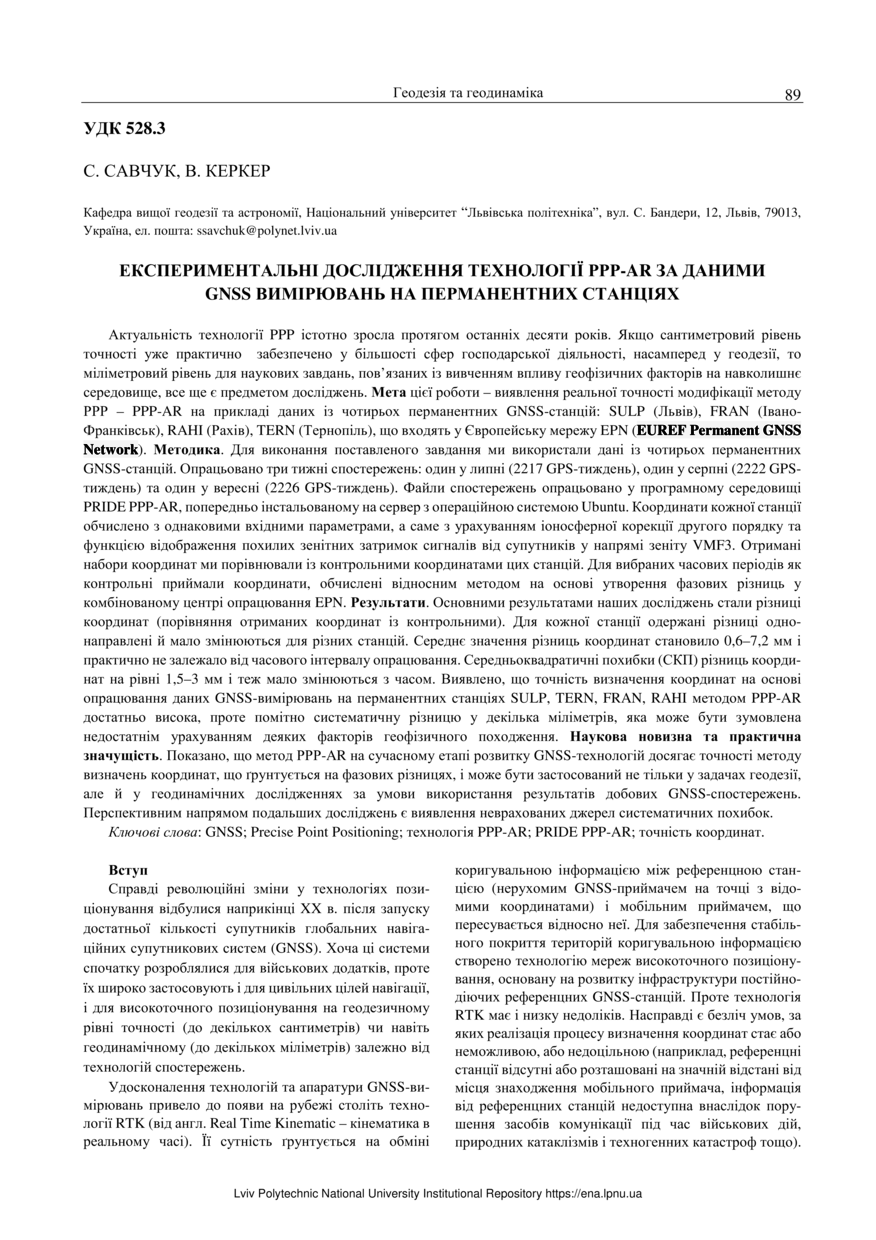 Савчук С. Експериментальні дослідження технологій РРР-AR за даними GNSS вимірювань на перманентних станціях / С. Савчук, В. Керкер // Сучасні досягнення геодезичної науки та виробництва. — Львів : Видавництво Львівської політехніки, 2023. — Том 1. — № 45. — С. 89–97.