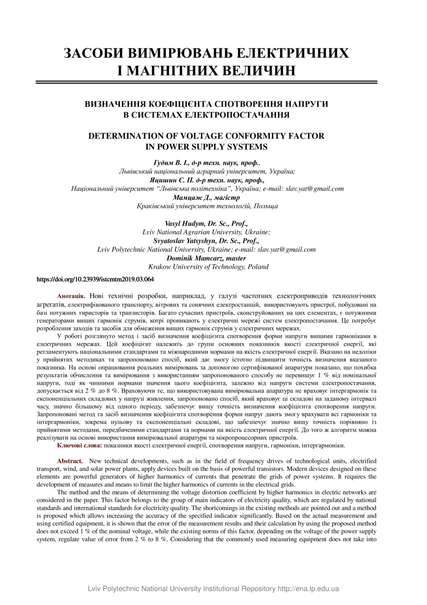 Гудим В. І. Визначення коефіцієнта спотворення напруги в системах електропостачання / В. І. Гудим, С. П. Яцишин, Д. Мамцаж // Вимірювальна техніка та метрологія : міжвідомчий науково-технічний збірник. — Львів : Видавництво Львівської політехніки, 2019. — Том 80. — № 3. — С. 64–72.