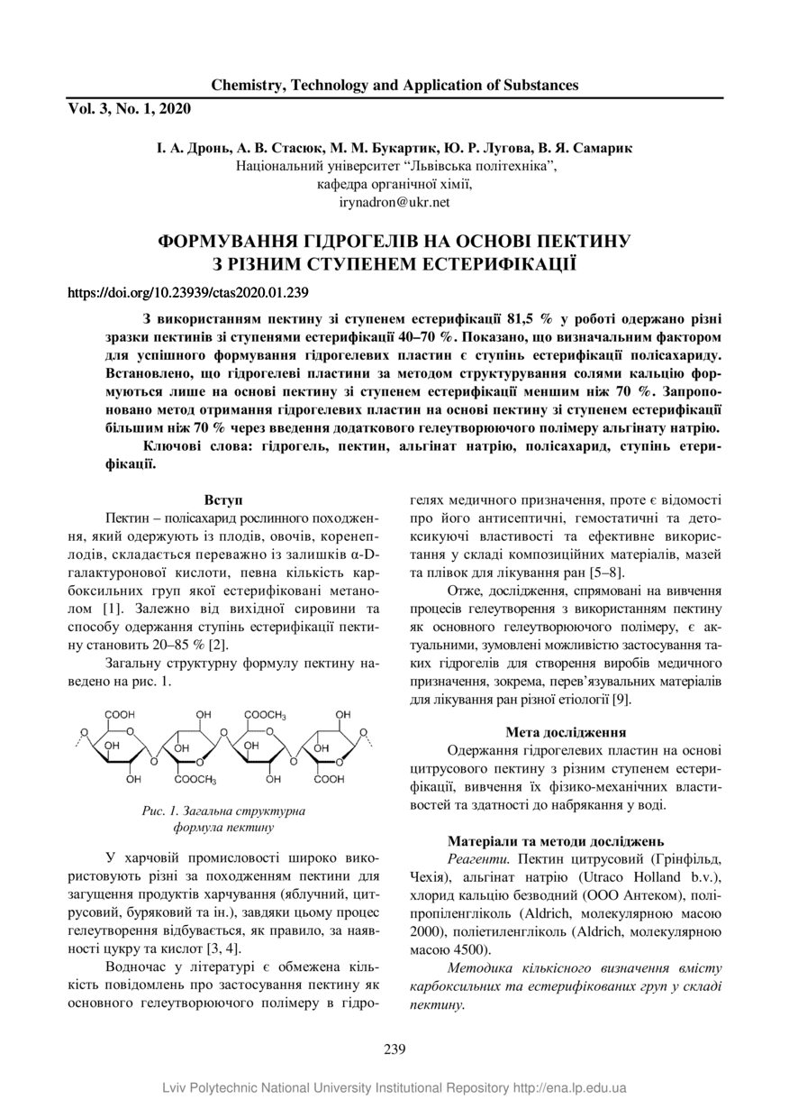 Формування гідрогелів на основі пектину з різним ступенем естерифікації / І. А. Дронь, А. В. Стасюк, М. М. Букартик, Ю. І. Лугова, В. Я. Самарик // Chemistry, Technology and Application of Substances. — Lviv : Lviv Politechnic Publishing House, 2020. — Том 3. — № 1. — С. 239–244.