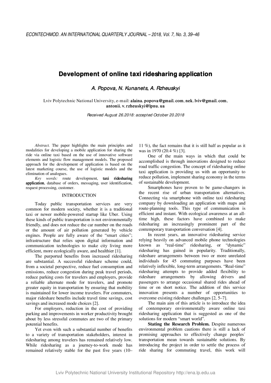 | dc.identifier.citation | Popova A. Development of online taxi ridesharing application / A. Popova, N. Kunanets, A. Rzheuskyi // Econtechmod. — Lublin, 2018. — Vol 7. — No 3. — P. 39–46. | |