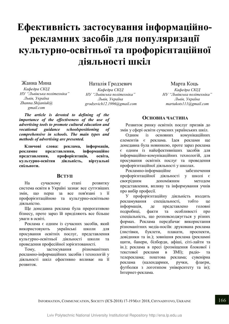 Мина Ж. Ефективність застосування інформаційно-рекламних засобів для популяризації культурно-освітньої та профорієнтаційної діяльності шкіл / Жанна Мина, Наталія Гродзевич, Марта Коць // Інформація, комунікація, суспільство : матеріали 7-ї Міжнародної наукової конференції, 17–19 травня 2018 року, Чинадієво. — Львів : Видавництво Львівської політехніки, 2018. — С. 166–167. — (Документознавство та інформаційна діяльність у системі сучасних наукових досліджень).