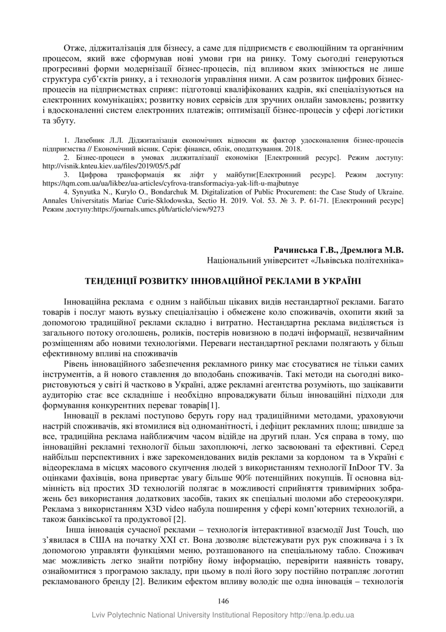 Рачинська Г. В. Тенденції розвитку інноваційної реклами в Україні / Г. В. Рачинська, М. В. Дремлюга // Управління інноваційним процесом в Україні: розвиток співпраці : тези доповідей VІІІ Міжнародної науково-практичної конференції, 18–20 червня 2020 року, Львів. — Львів : Видавництво Львівської політехніки, 2020. — С. 146–147. — (Механізм управління інноваційним процесом).