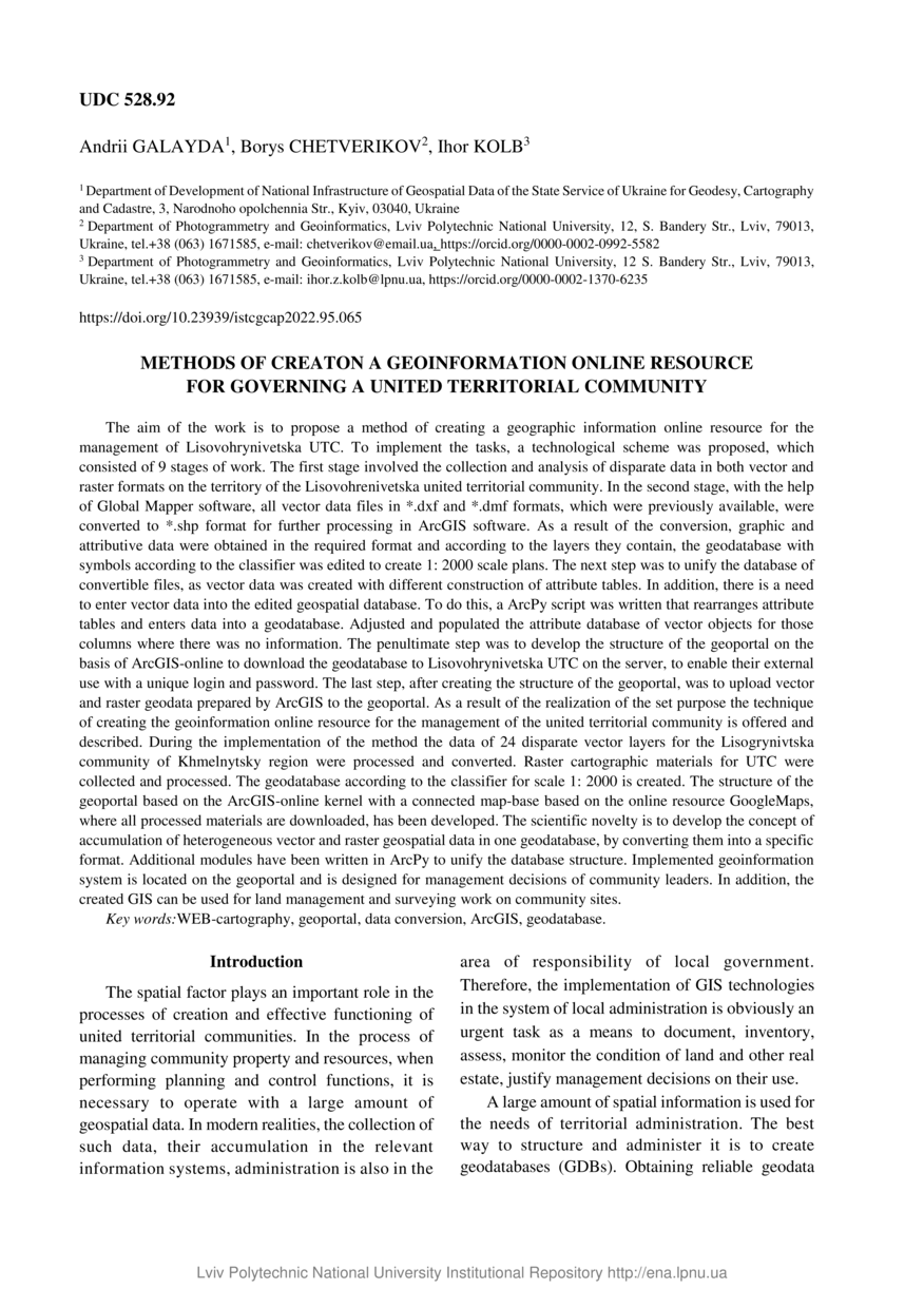 Galayda A. Methods of creaton a geoinformation online resource for governing a united territorial community / Andrii Galayda, Borys Chetverikov, Ihor Kolb // Geodesy, Cartography and Aerial photography. — Lviv : Lviv Politechnic Publishing House, 2022. — Vol 95. — P. 65–76.