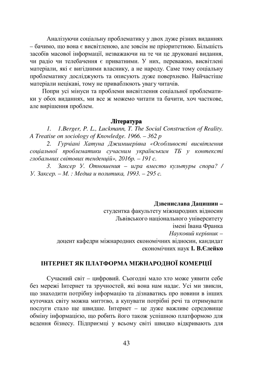 Дацишин Д. Інтернет як платформа міжнародної комерції / Дзвенислава Дацишин, І. В. Єлейко // Проблеми журналістики: вчора, сьогодні, завтра :збірник матеріалів I Міжнародної наукової онлайн-конференції студентів та молодих дослідників, 4 квітня 2019 року, Львів. — Lviv : Видавництво Львівської політехніки, 2019. — P. 43–46.