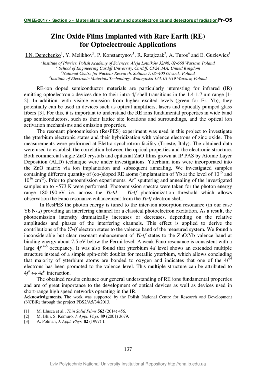 Lviv, Ukraine. — Lviv, 2017. — P. 137. — (5 materials for quantum and optoelectronics and detectors of radiation).